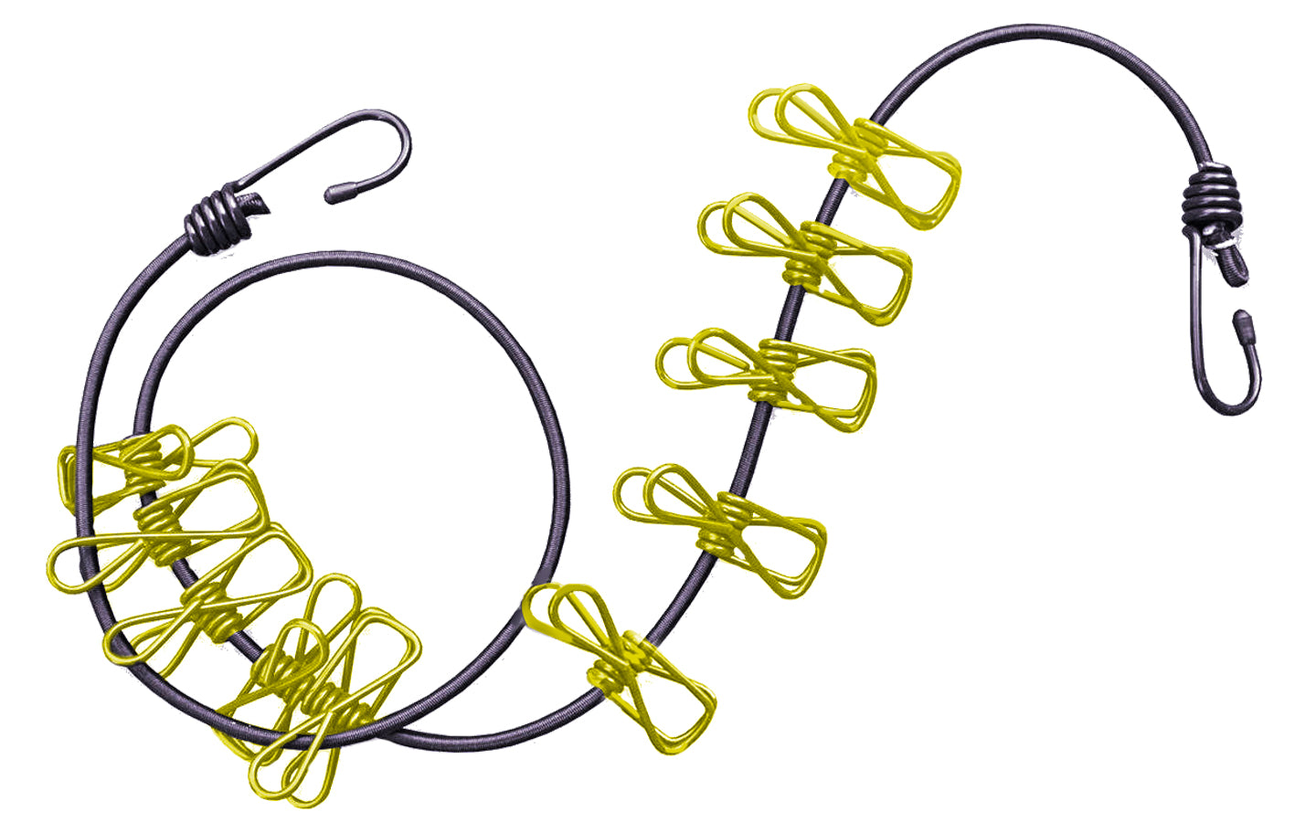 Corda stendibiancheria estensibile con 2 ganci di fissaggio alle estremità e 12 mollette in metallo. Lunghezza: 1,9 / 3,5 m.